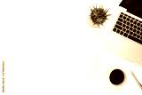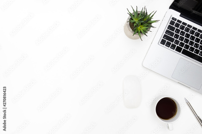 White office desk table with laptop computer, cup of coffee and supplies. Top view with copy space, flat lay.