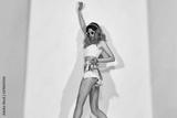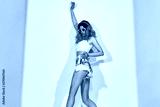 Excited fashionable DJ girl dance in colorful neon light. Creative music night club vibes. High Fashion. Sexy Woman with Dyed Hair in glamor outfit, stylish heels, dancing summer neon concept