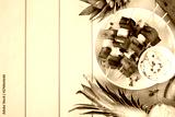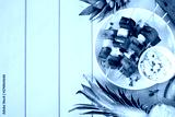 Grilled watermelon and pineapple fruit kabobs. Top view side border on a pink wood background. Summer food concept.