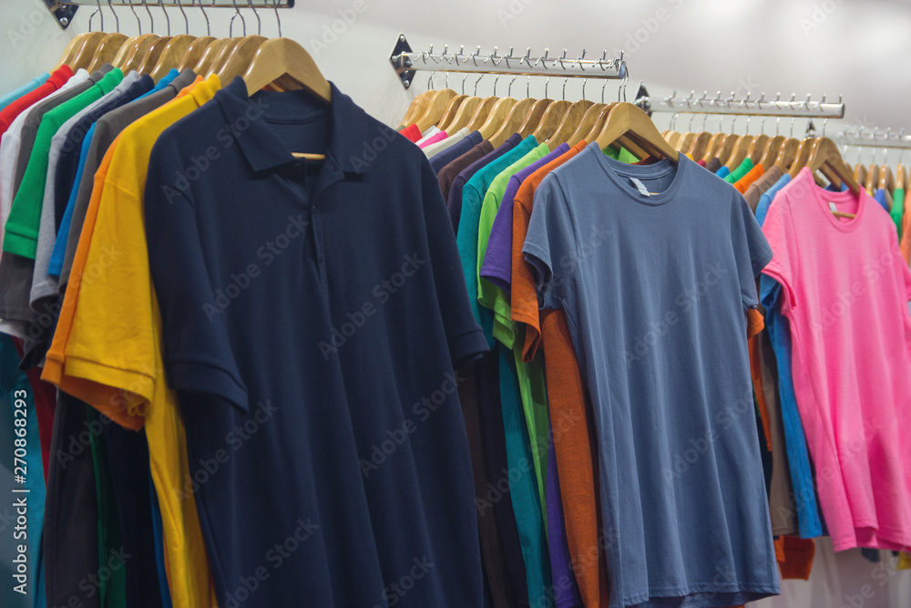 Variety of t-shirts of different colors on wooden hangers