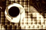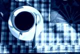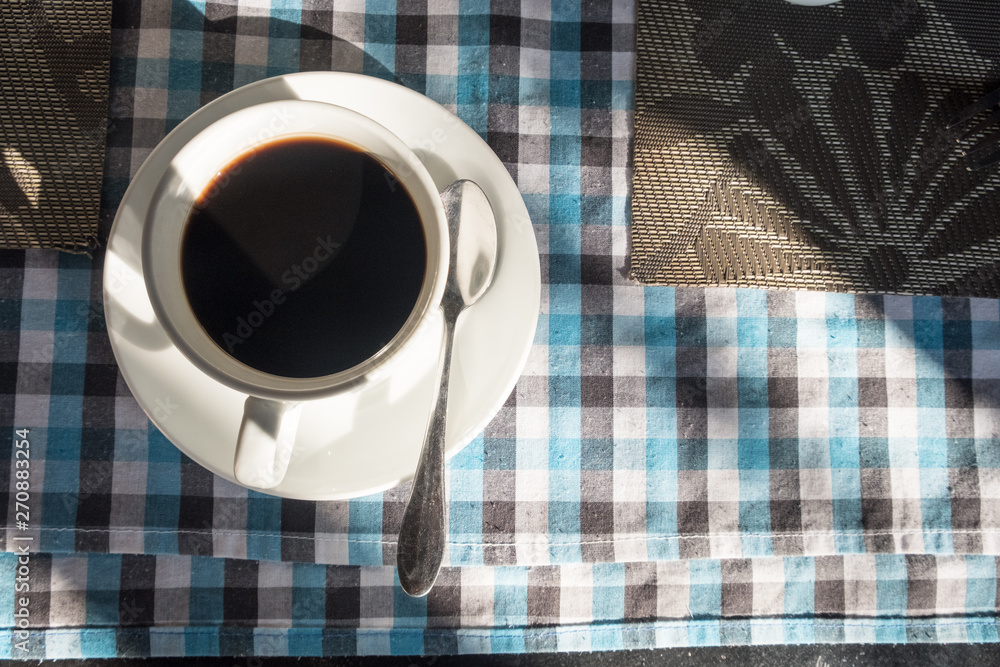 Top view of a cup of black coffee on the table with shade of light and shadow in the morning.