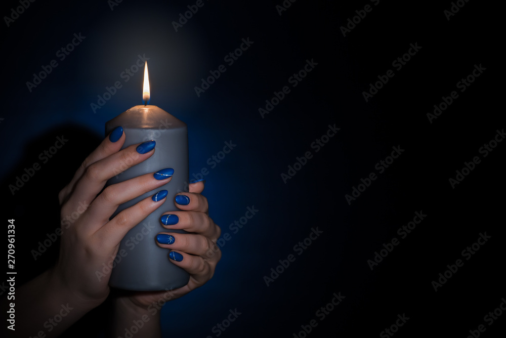 beautiful female hands hold a big burning candle on a black blue background, blue nails, stars on the nails, manicure, bright flame, mystery and magic