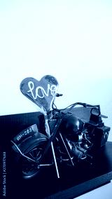 Metal motorcycle toy model on a wooden shelf with a lollipop in the shape of a heart