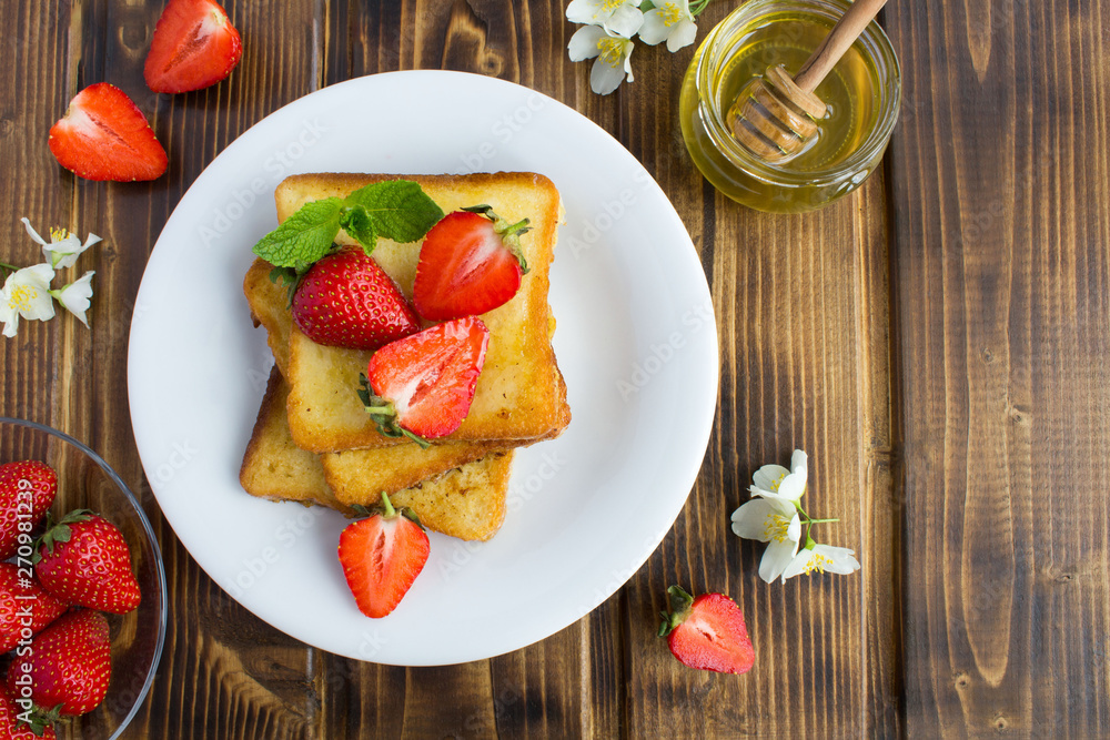 French toasts with strawberries and honey in the white plate on the rustic wooden background.Top view.Copy space.Closeup.