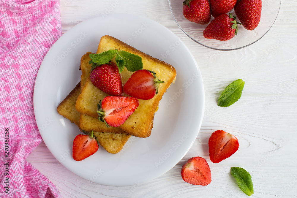 French toasts with strawberries and honey in the white plate on the white wooden background.Top view.Copy space.Closeup.
