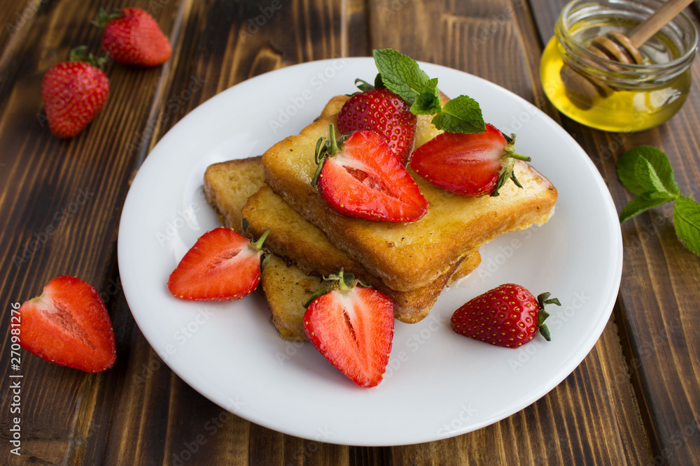 French toasts with strawberries and honey in the white plate on the brown wooden background
