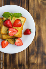 French toasts with strawberries and honey in the white plate on the brown wooden background.Top view.Copy space.
