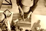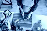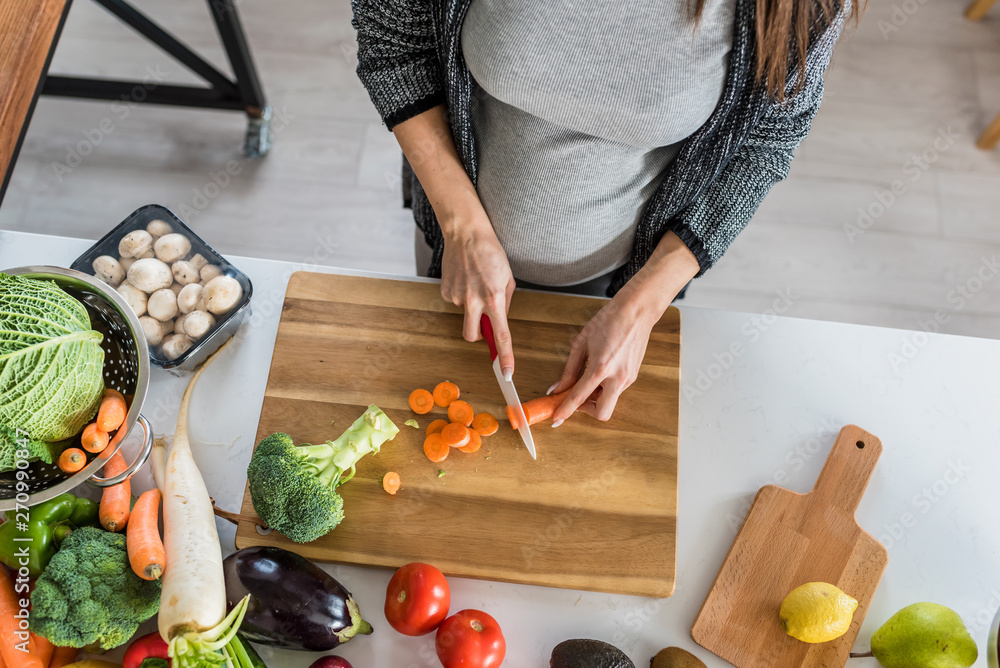 Beautiful smiling young pregnant woman preparing healthy food with lots of fruit and vegetables at home kitchen