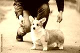 A man hand feeds a Pembroke Welsh Corgi puppy.