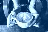 Close up of someone hands holding a cup of hot milk coffee (Latte coffee of Cappuccino coffee etc.)