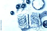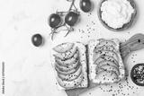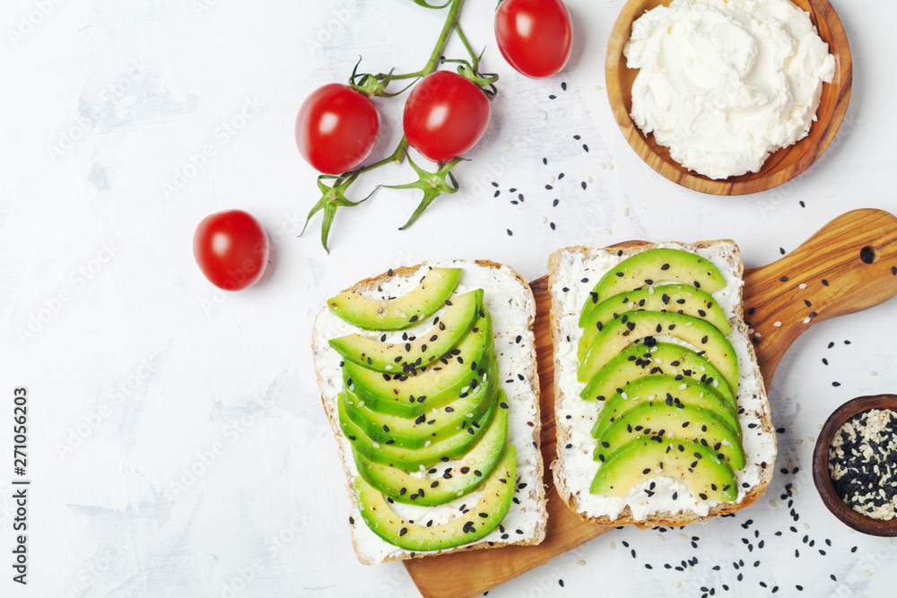 Sandwich with creamy cheese and avocado for healthy snack or breakfast. Top view.