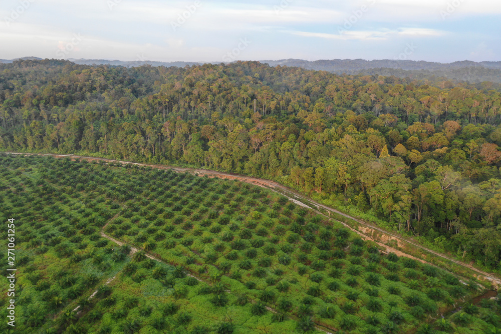 Palm oil plantation at rainforest edge