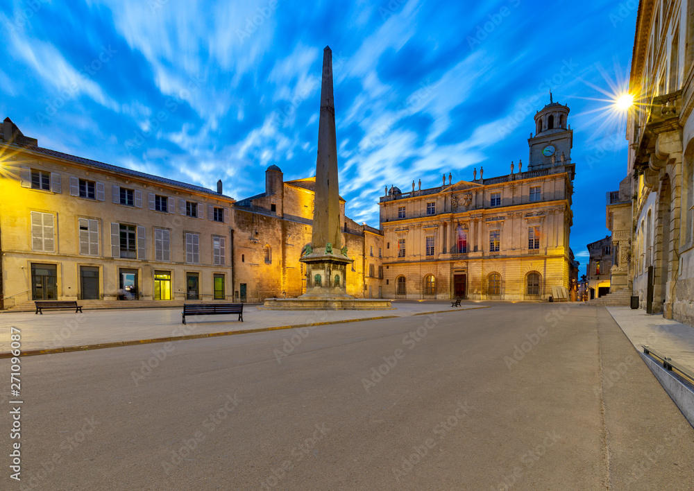 Arles. Republic Square and City Hall at sunset.