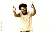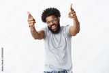 You rock man. Portrait of joyful good-looking emotive dark-skinned guy with afro hairstyle and beard pointing finger pistols at camera with raised hands and broad smile as liking dance moves of friend