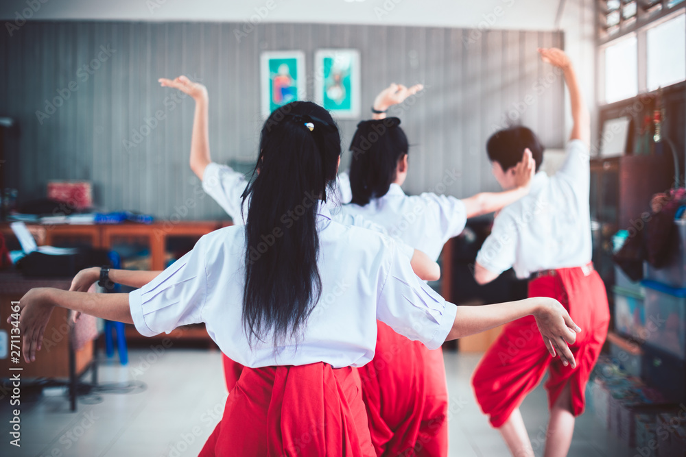 Asian young girl uniform students learning Thai dance