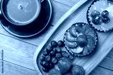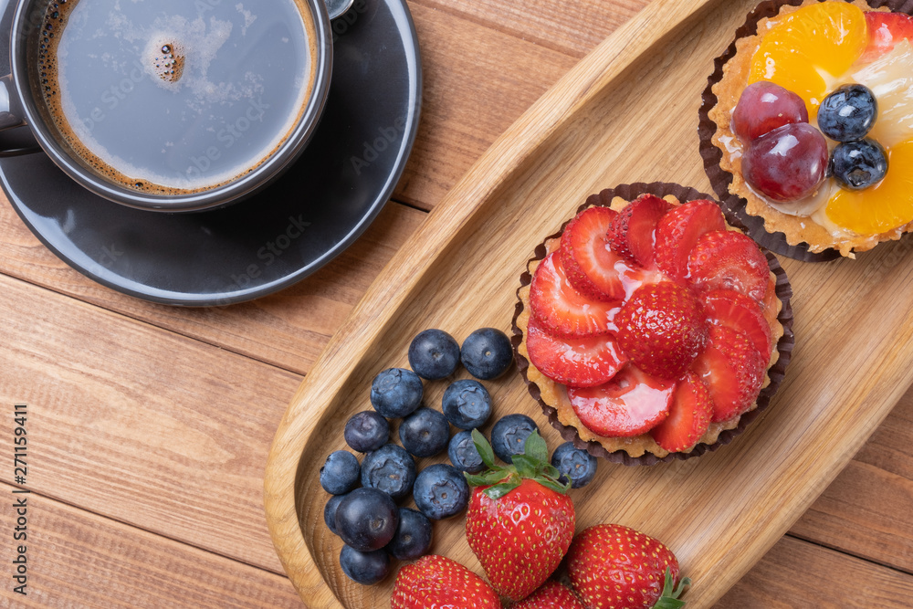 fruit tartlets on a wooden plate and cup of coffee on the table, fruit baked shell, fruit cupcake with berry