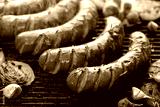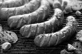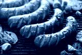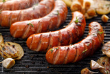 Grilling sausages with the addition of herbs and vegetables on the grill plate, close-up. Grilling food, bbq, barbecue