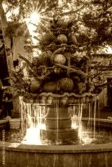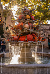 late afternoon sunlight shining through the autumn decor with pumpkins and cholla cactus wood on a fountain at the Tlaquepaque Arts & Shopping Village in Sedona, Arizona