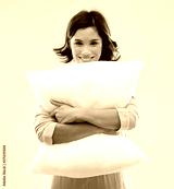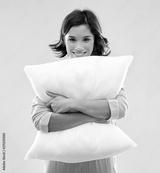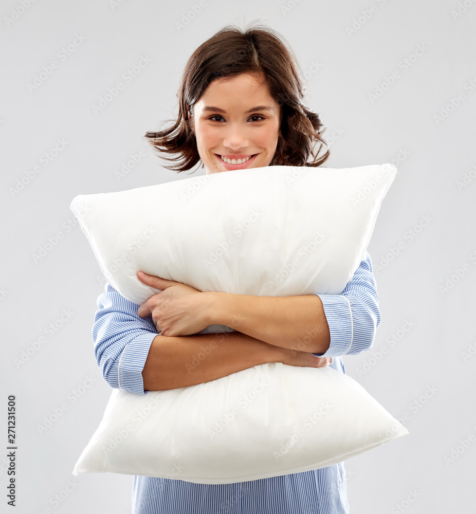 people and bedtime concept - happy young woman in pajama hugging pillow over grey background