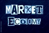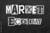 MARKET ECONOMY text word collage, multi colored fabric on blue denim, supply and demand concept, horizontal aspect