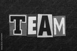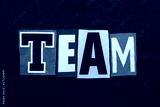 TEAM text word collage, multi colored fabric on blue denim, teamwork concept, horizontal aspect