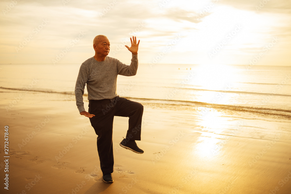 Asian Senior old man practice Tai chi and Yoga pose on the beach sunrise