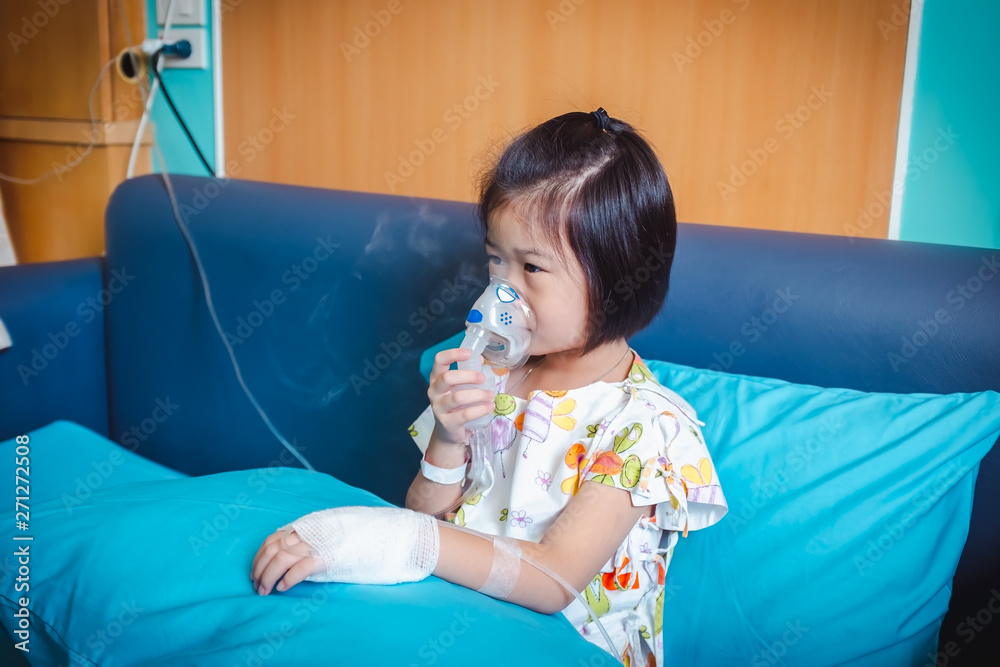 Sad asian child holds a mask vapor inhaler for treatment of asthma. Breathing through a steam nebulizer.Illness girl admitted in hospital while saline intravenous (IV) on hand.
