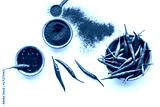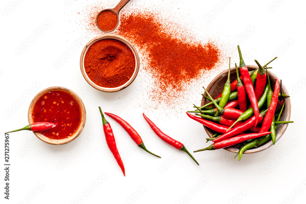 Dry powder and fresh red and green chilli pepper as food ingredient on white table background top view