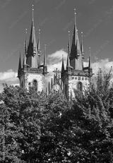 Prague, Czech republic. Church of Our Lady Before Tyn cathedral. Top spires roof. Summer sunny day and blue sky with clouds. Green trees in front of building.