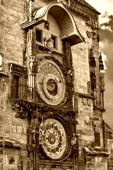 Prague, Czech Republic. Ancient astronomical clock with calendar and statues on stone wall of tower of town hall. Famous touristic landmark in european capital.