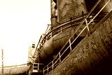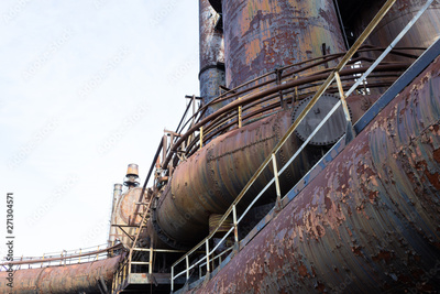Curved industrial pipes and tubes of old steel mill with heavy patina of rust, copy space, horizontal aspect