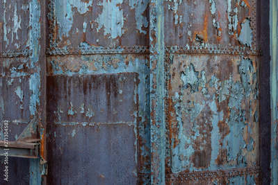 Creative industrial background with rusty metal, rivets, and peeling paint patinas, horizontal aspect