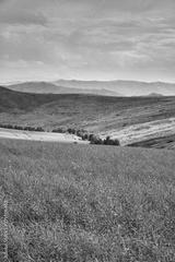 Beautiful panoramic aerial summer view at sunset to the Bukhtarma mountains in the valley of the river Irtysh, eastern Kazakhstan
