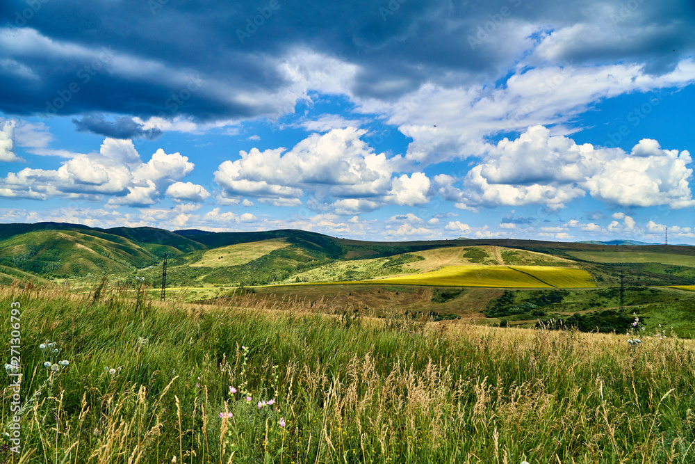 Beautiful panoramic aerial summer view at sunset to the Bukhtarma mountains in the valley of the river Irtysh, eastern Kazakhstan
