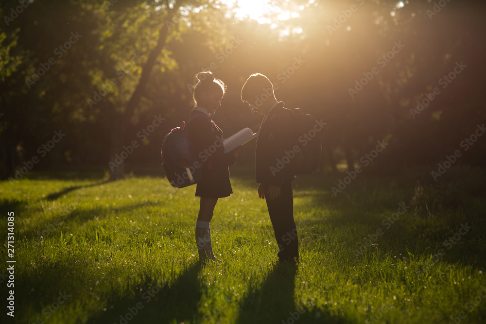 two school children, little girl and little boy read from the book, in the school uniform, schoolbag, at sunset, outdoor