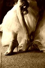 Beautiful female legs in stylish shoes on a high heel, the bride puts on wedding shoes on high heel