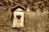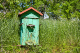 Old wooden beehive in a rural garden.