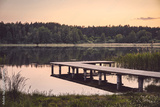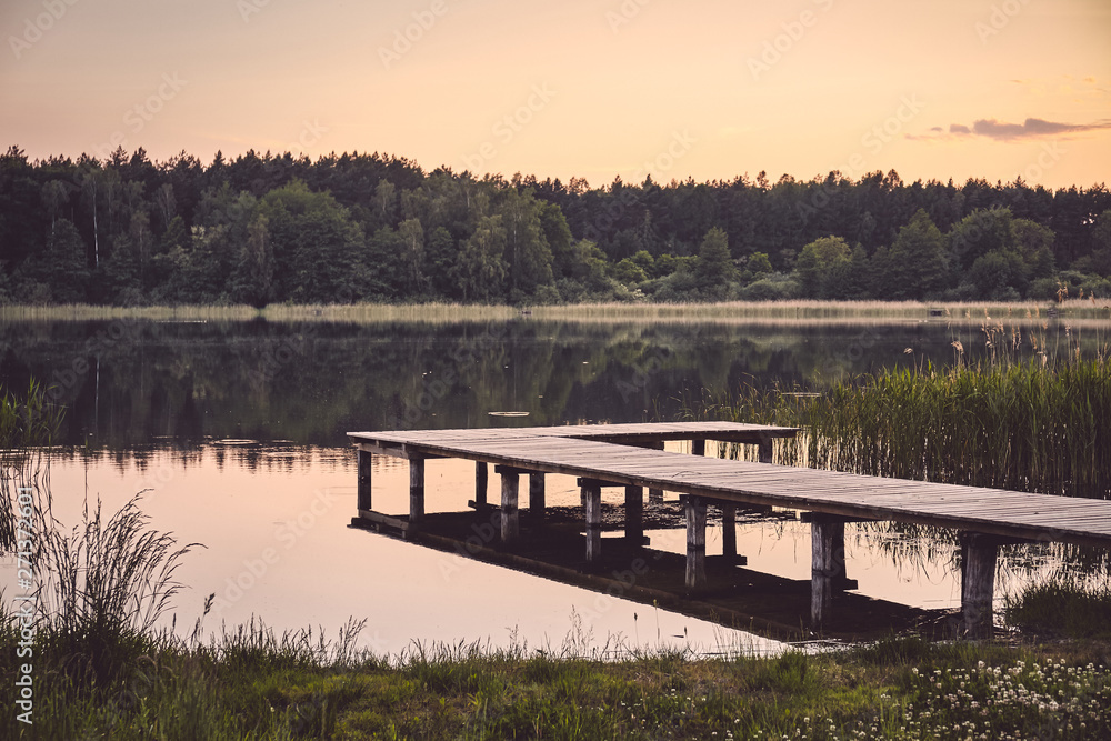 Wooden pier at a calm lake at sunset, color toning applied.