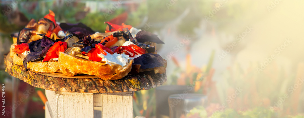 Beautifully decorated catering banquet table with different food snacks and appetizers with sandwich, caviar, fresh fruits on corporate christmas birthday party event or wedding celebration