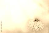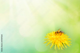 Beautiful dandelion flower on spring yellow meadow and flying bumblebee macro on soft blurry light green background. Concept hot summer in sunshine in nature. Space for text