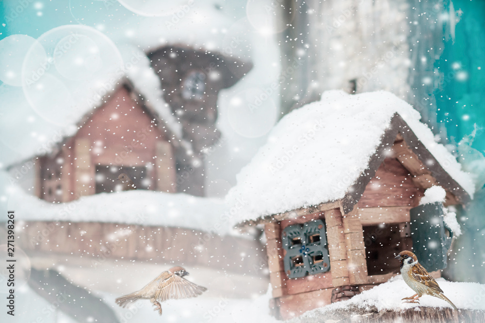 A pair of gray and brown sparrows eats i and squirrel feeder house from plywood in the winter park