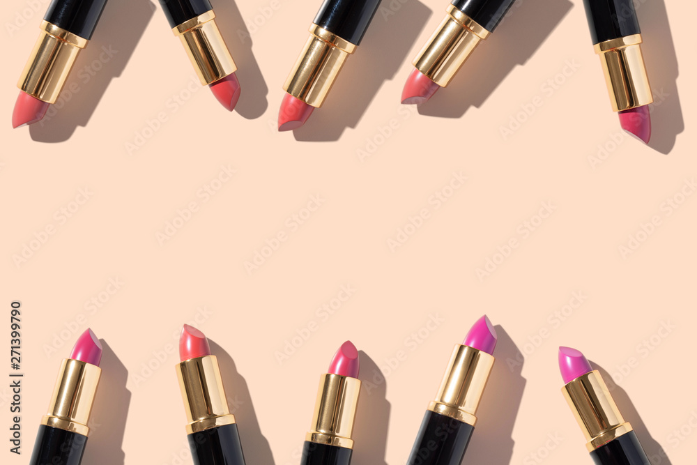 Set of color lipsticks on color background. Flat composition beauty, fashion. flat lay, top view