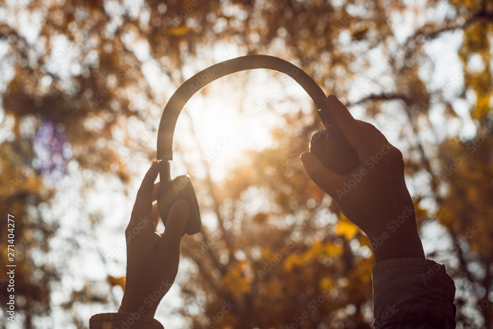 Female with headphones walking on the park listen sounds or music of autumn forest. Concept. Indian summer season