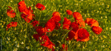 flowers of red poppies among other field flowers and herbs - closeup