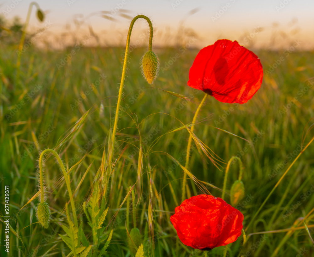 flowers of red poppies among other field flowers and herbs - closeup