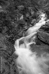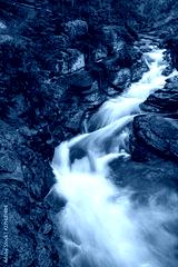a beautiful waterfall cuts through the rocks at Maligne Canyon, Jasper National Park, Canada, long exposure to create blurred motion to the water, nobody in the image
