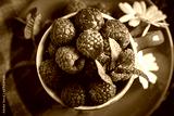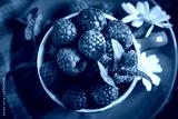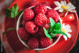 Raspberry in a red cup with chamomile and leaves on a dark background. Summer and healthy food concept. Selective focus. Flat lay.