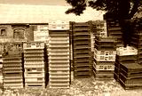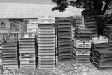 Empty plastic containers used for vegetables transportation piled at a farmyard.