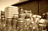 Empty plastic barrels and containers used in food processing piled at a farmyard.
