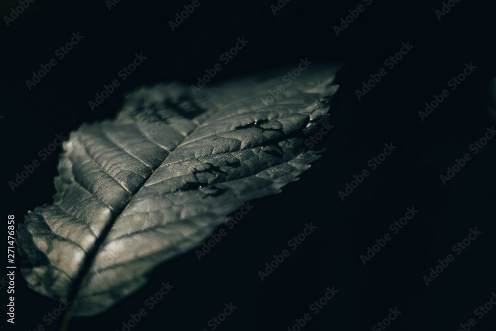 Dark nature background of fresh spring leaf in the forest – Wild lush vegetation in dim light – Detailed texture of plants in an organic environment